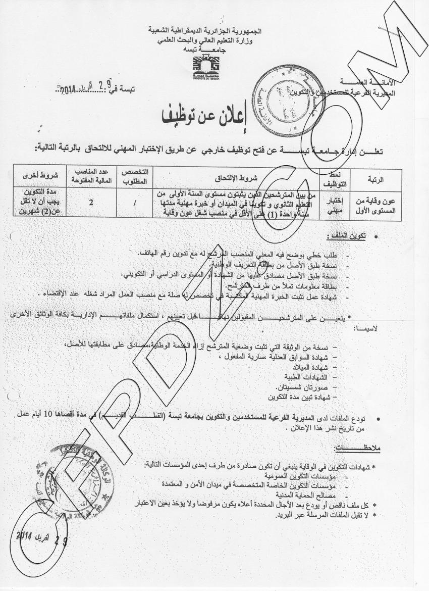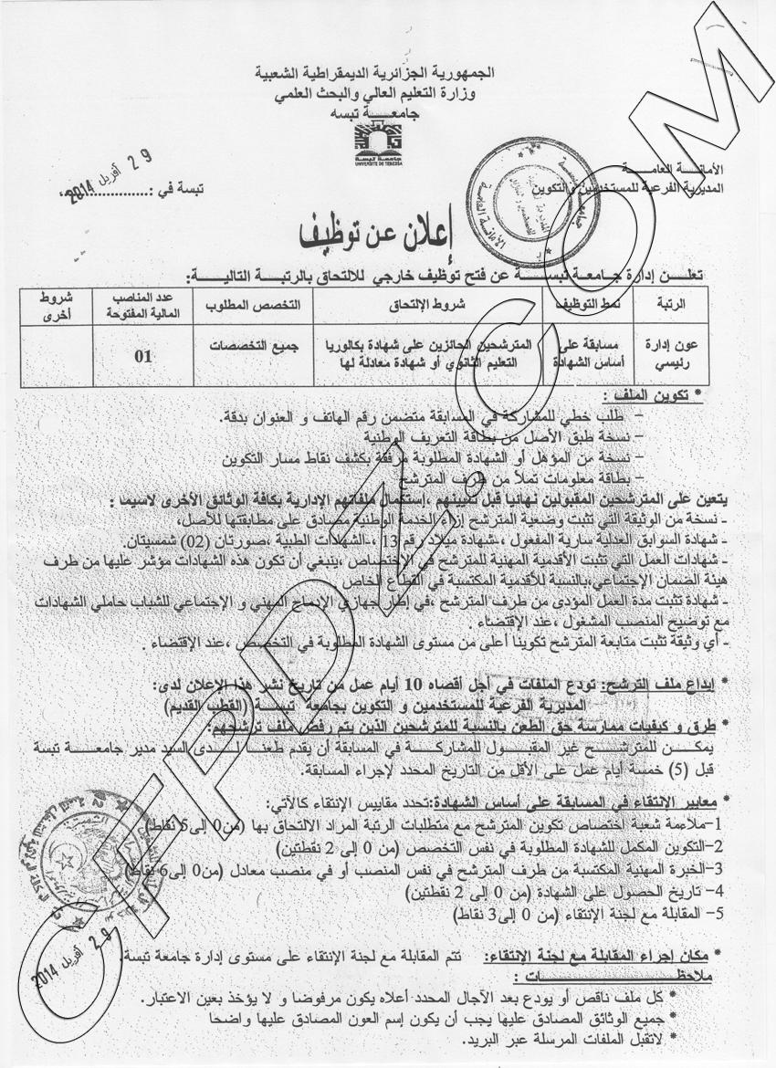 إعلان مسابقة توظيف جامعة تبسة ماي 2014