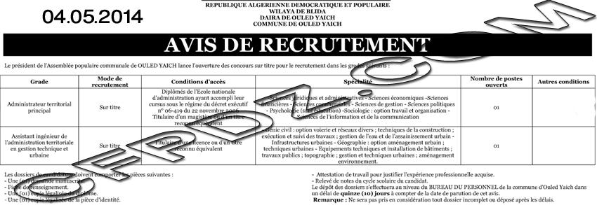 إعلان مسابقة توظيف بلدية أولاد يعيش دائرة أولاد يعيش ولاية البليدة ماي 2014
