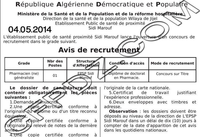 إعلان مسابقة توظيف المؤسسة العمومية للصحة الجوارية سيدي معروف جيجل ماي 2014